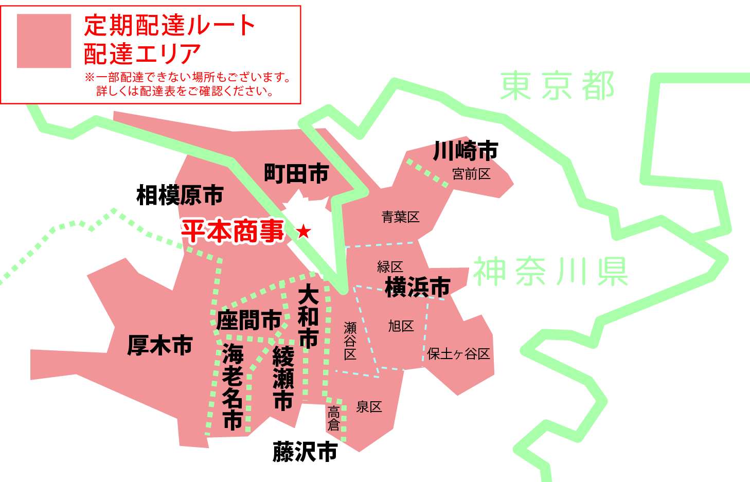 町田市、相模原市、大和市、藤沢市、海老名市、厚木市、綾瀬市、座間市、横浜市、川崎市